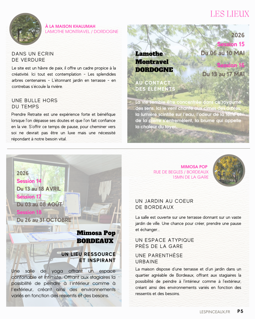Au fil des saisons, les stages à Bordeaux et ceux en immersion en Dordogne reprennent au printemps. Les inscriptions sont ouvertes et certaines sessions sont complètes. Il est possible de s’inscrire en liste d’attente. Avant toute inscription je vous propose un échange téléphonique pour vous expliquer la méthode VEDIC ART® et pour faire connaissance.